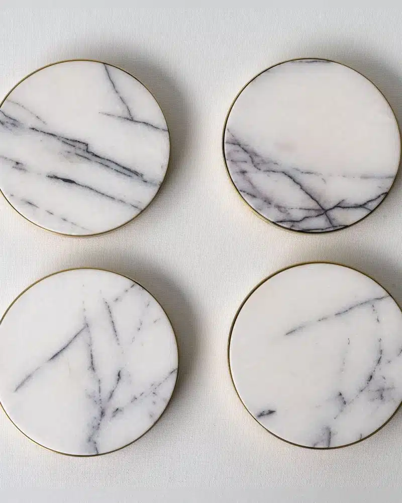 ASAWA coasters combine the natural beauty of marble and travertine with the elegance of brass to create a stunning balance. The hand-set natural stones in satin brass frames create a striking contrast with their unique veins and color tones. They not only protect your furniture from unwanted drink stains, but also add sophistication and aesthetics to your home decor. The natural weight of marble and travertine ensures that the coaster stays firmly in place while providing a stable surface for your favorite drinks. A hand crafted four piece set comes in a unique colour and veining specific to marble. ASAWA coasters come in white, black, Calacatta viola marble and travertine.