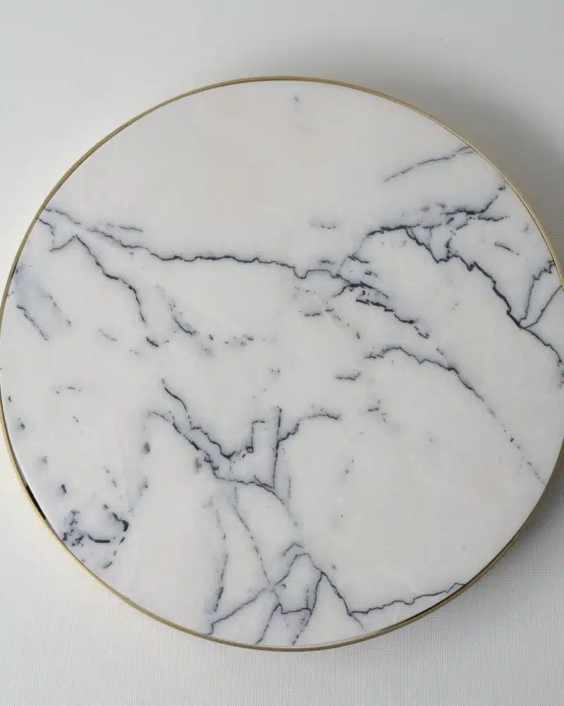 ASAWA Round cheese and charcuterie tray, with its natural tone and unique/sinuous vein structure. This is the perfect setting to present the finest selection of cheese and cold cuts/charcuterie. The brass handle cutouts on both sides of the brass frame make it easy to lift the stone piece, while the handcrafted natural stone varieties that sit on the frame’s bottom create a classy and sophisticated design. The natural marble or travertine, which stays cool to the touch, keeps foodstuffs from getting too warm and supports their freshness.