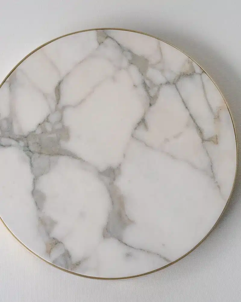 ASAWA Round cheese and charcuterie tray, with its natural tone and unique/sinuous vein structure. This is the perfect setting to present the finest selection of cheese and cold cuts/charcuterie. The brass handle cutouts on both sides of the brass frame make it easy to lift the stone piece, while the handcrafted natural stone varieties that sit on the frame’s bottom create a classy and sophisticated design. The natural marble or travertine, which stays cool to the touch, keeps foodstuffs from getting too warm and supports their freshness. This object offers versatility and can be used for many purposes to showcase jewelry, decorative items, candles, and vases in any room or area of your home. The natural marble or travertine piece can also be removed from below in order to be wiped down if necessary.